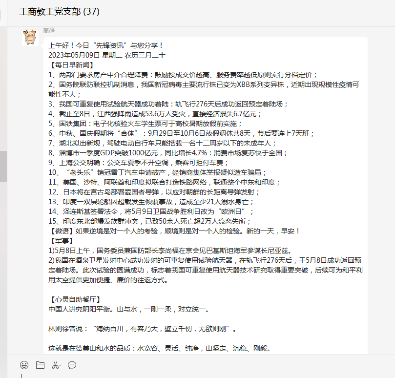 “先锋资讯”栏目包含新闻播报、心灵自助餐厅、党务百科等板块内容。让全体党员以快捷方式知晓天下新闻,心灵适时得到净化和引领,并且充实了党课教育的内容。各个板块之间内容交互融合,形成合力,全方位提升了党员老师的综合素质。此活动以微信群为载体,要求大家每天打卡学习,使得党员老师可以时刻关注活动的最新进展,学到先进的典型经验。通过互动学习,相互交流,激发了全体党员的学习热情。大家纷纷表示一定要用系统观念,在一体推进上持续用力,把学习和实干结合起来,推动bv伟德国际1946官网的工作走向高质量发展的新阶段。(编辑:景勤娟 审核:韩晓霞)