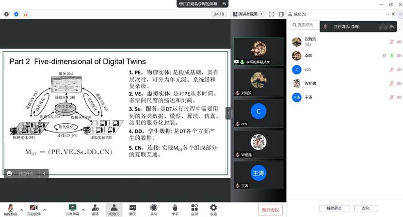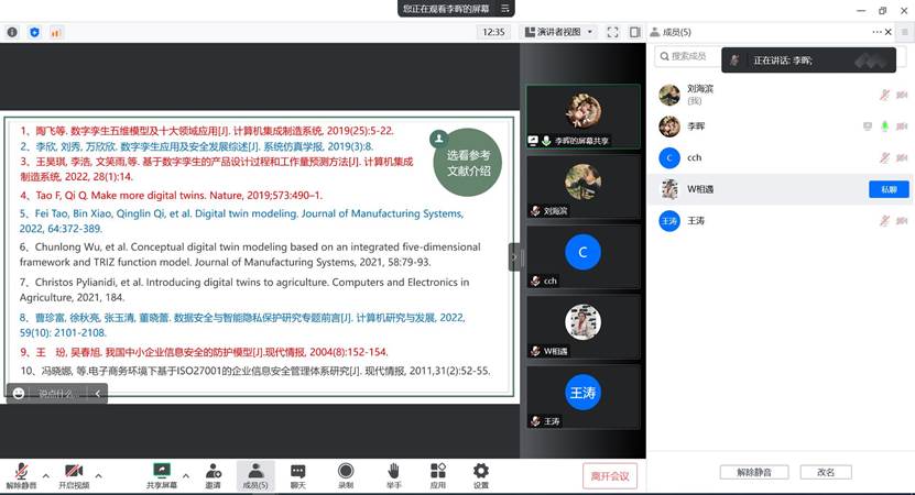 2022年11月3日下午,在刘海滨副经理的带领下,数字孪生与智慧管理科研团队通过腾讯会议如期开展了第二次讨论活动。首先,由李晖老师从自身研究内容出发,从近期所看的文献、数字孪生的五维概述、基于数字孪生五维解决企业隐私保护问题等多个方面进行了学习内容分享。之后,参会老师积极进行讨论,讨论内容包括:数字孪生目前面临的挑战、隐私信息保护的概念、及基于数字孪生思想在隐私保护方面存在哪些挑战等问题。最后,刘海滨副经理针对团队在数字孪生方面的学习及讨论,给出了充分的肯定,并激励团队成员奋发进取,继续砥砺前行,以二十大精神为旗帜,取得更多科研成绩。(撰稿人:李晖,审核人:刘海滨)