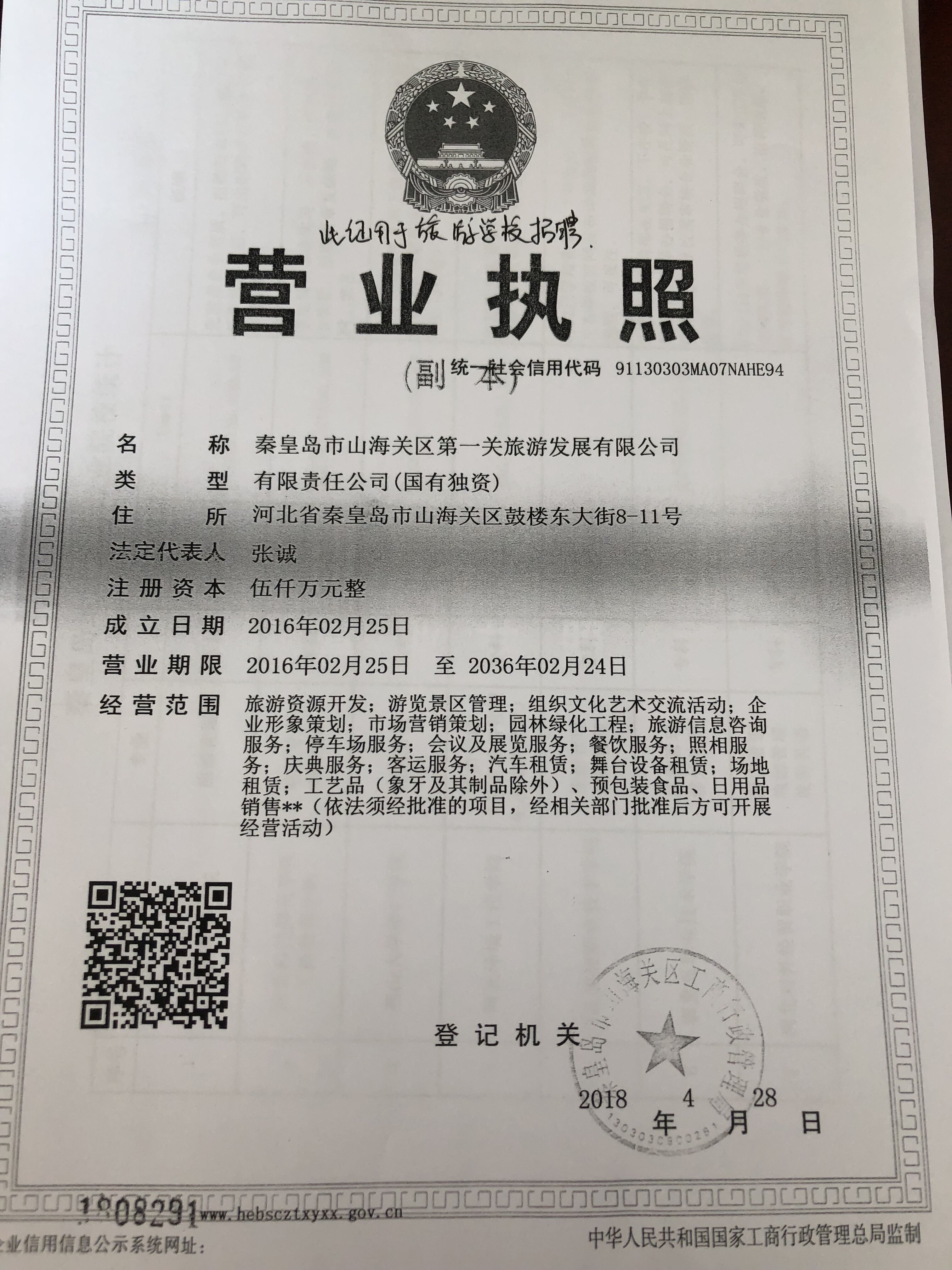 公司地址:秦皇岛市山海关区石河旺角第一关旅游发展有限公司