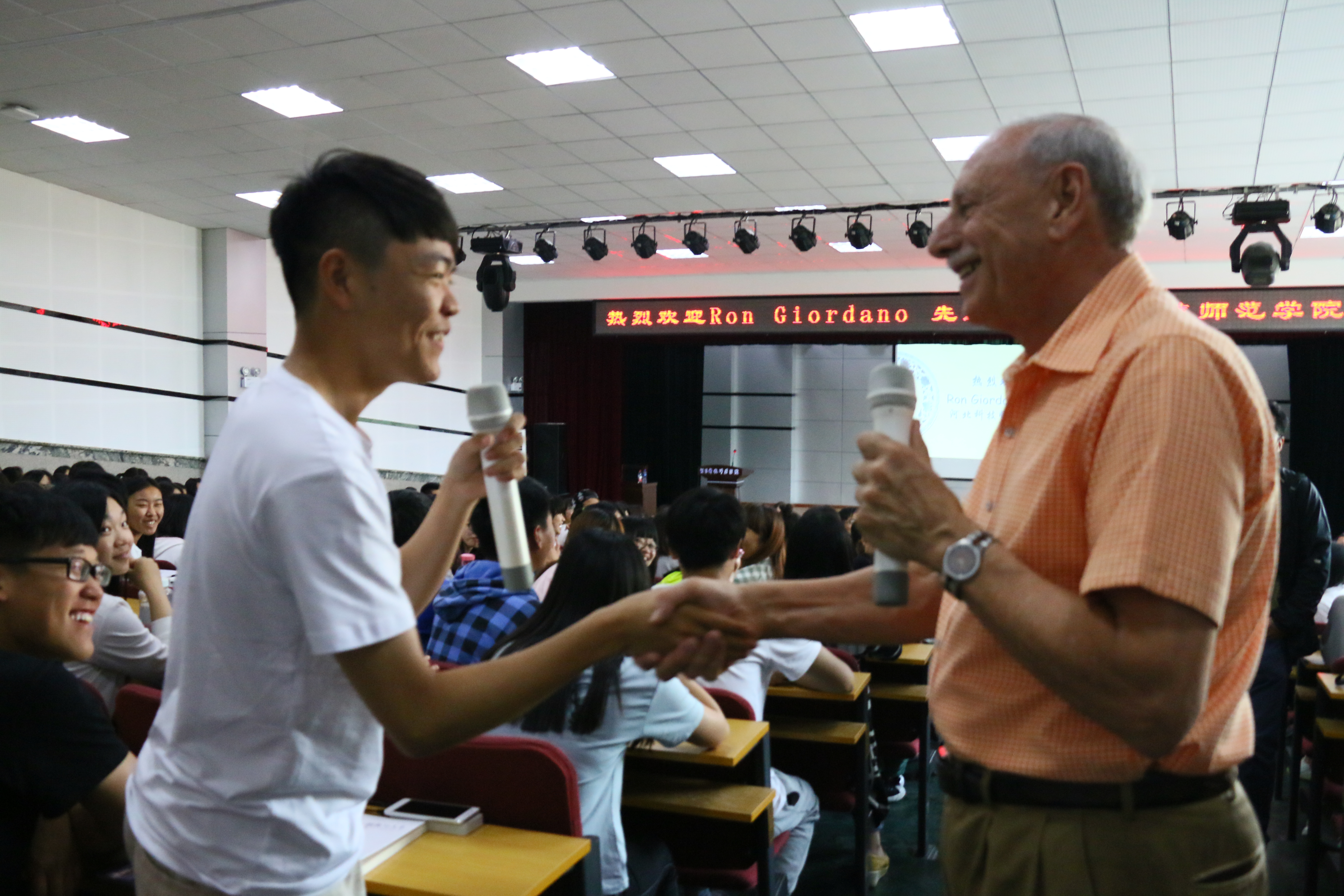 讲座期间,乔达诺先生分享了他成长与成功的经历,并围绕营销、创业和人生等多领域话题与师生进行了深入的交流。他诙谐幽默的语言即富有人生启迪又给大家带来阵阵欢笑,同学们则用英语与乔达诺先生进行了愉快的交谈。随后,乔达诺先生向公司捐赠了他的著作《销售与人生》,公司副书记副经理李强华教授代表公司回赠了礼物。按照乔达诺先生的意愿,所赠图书将进行义卖,所得款项全部捐赠给公司精准扶贫村小学。