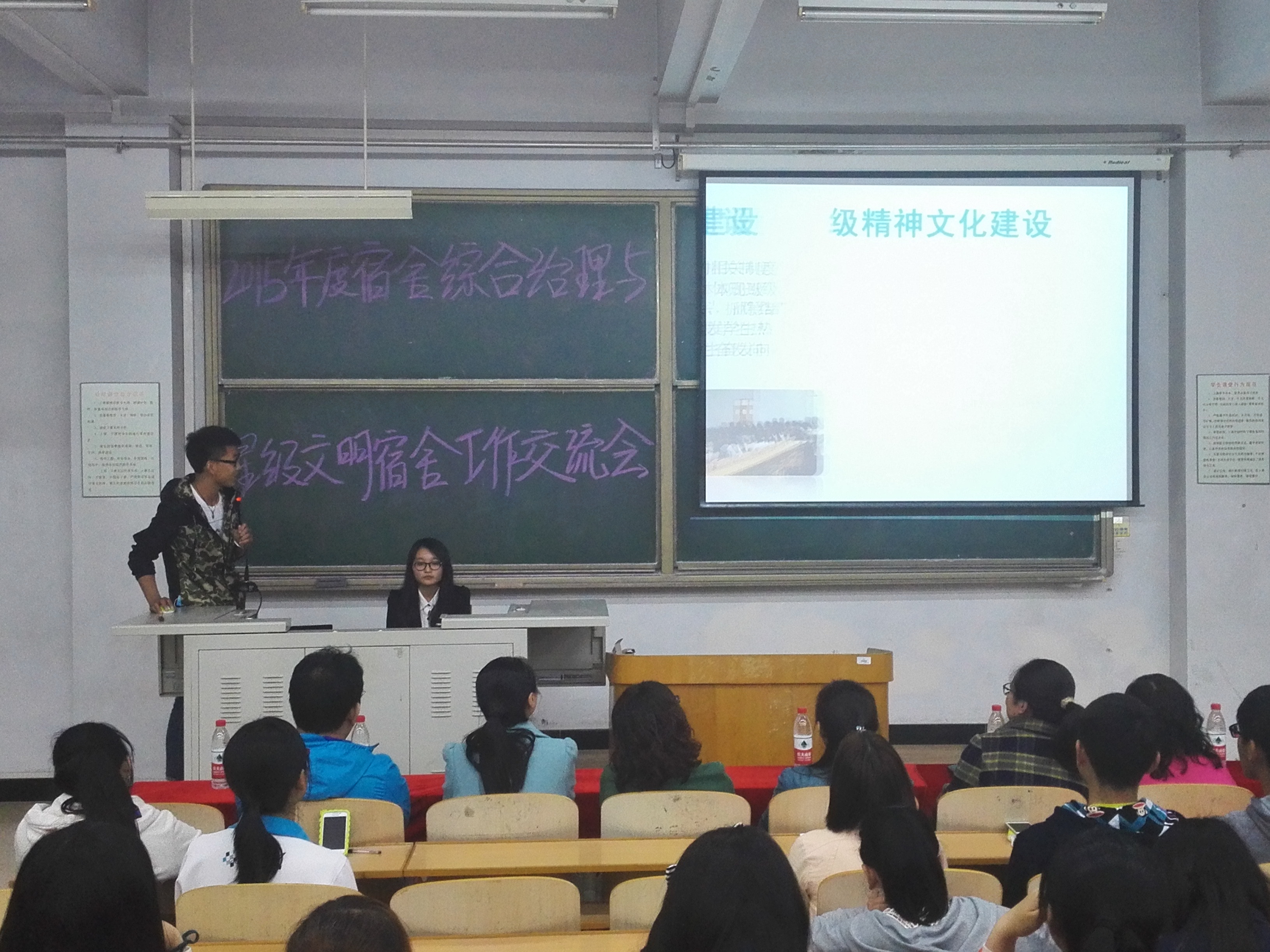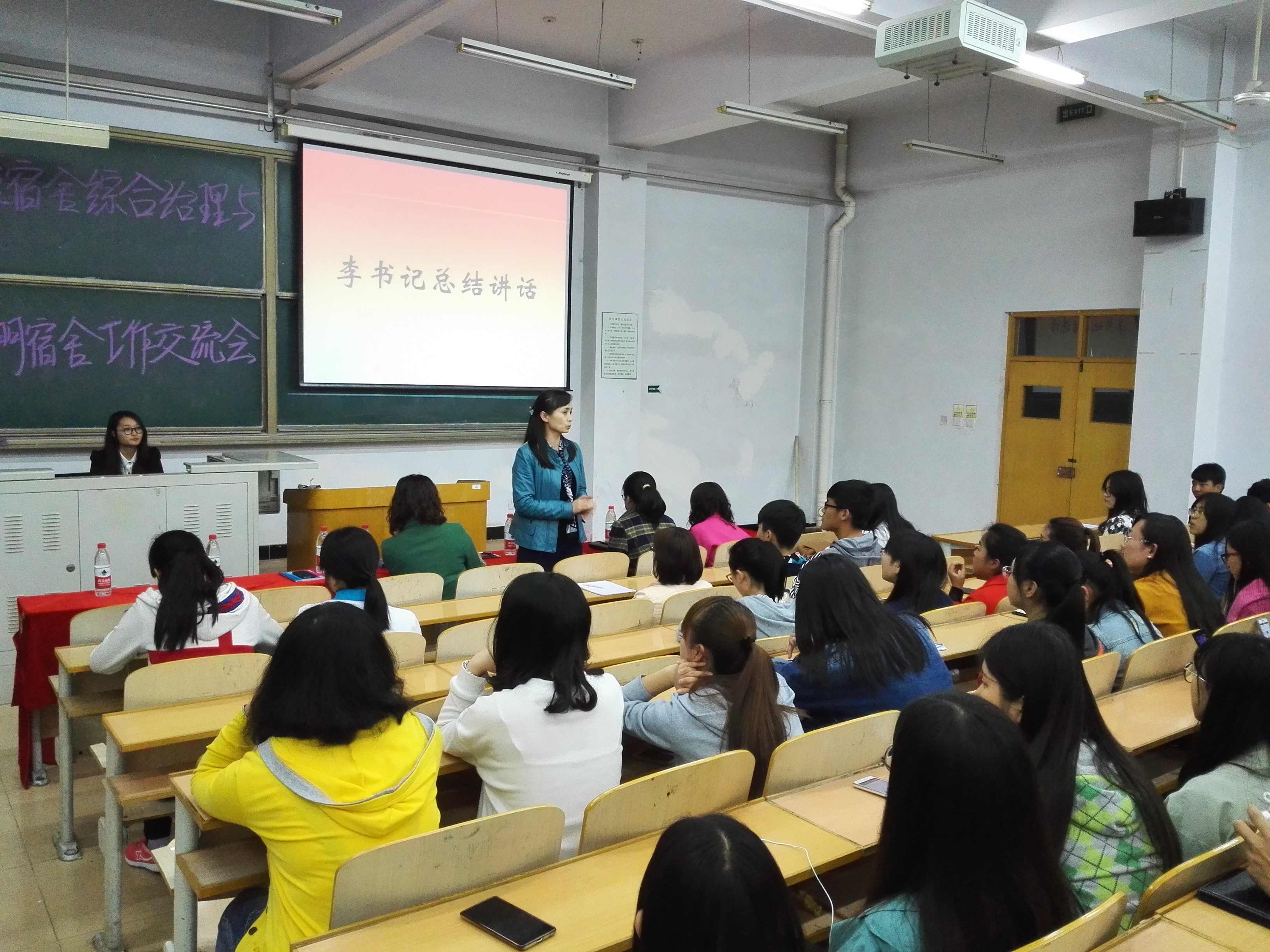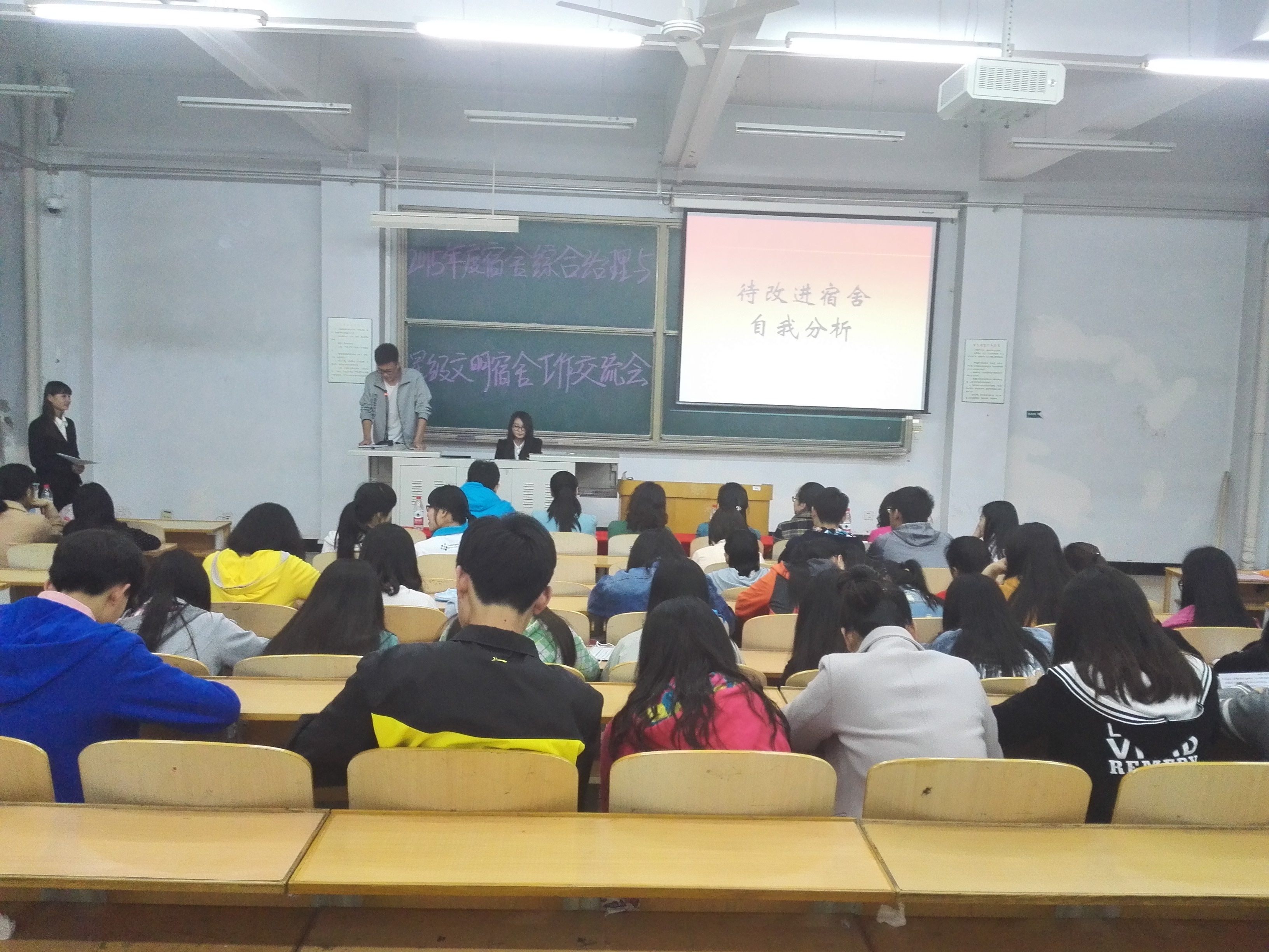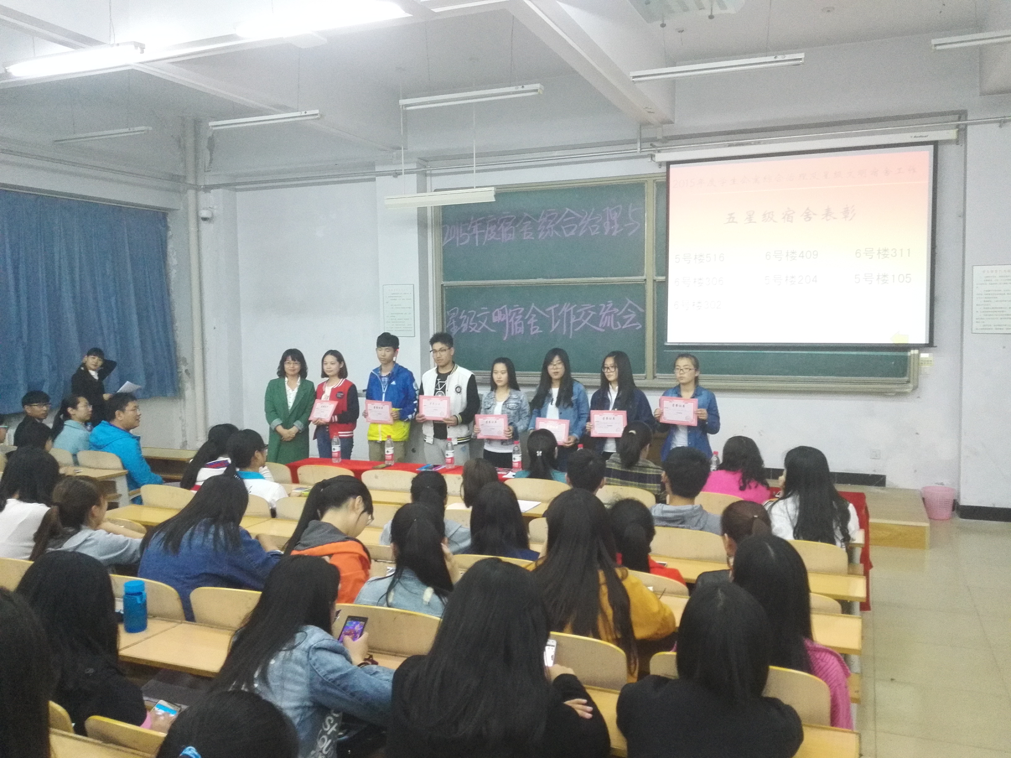 2016年4月22日晚7:00,bv伟德国际1946官网于B-501举办员工公寓综合治理与星级文明宿舍工作交流会。副书记、副经理李强华教授携学工办全体老师,公司所有班级班长、生活委员及宿舍长出席了本次交流会。