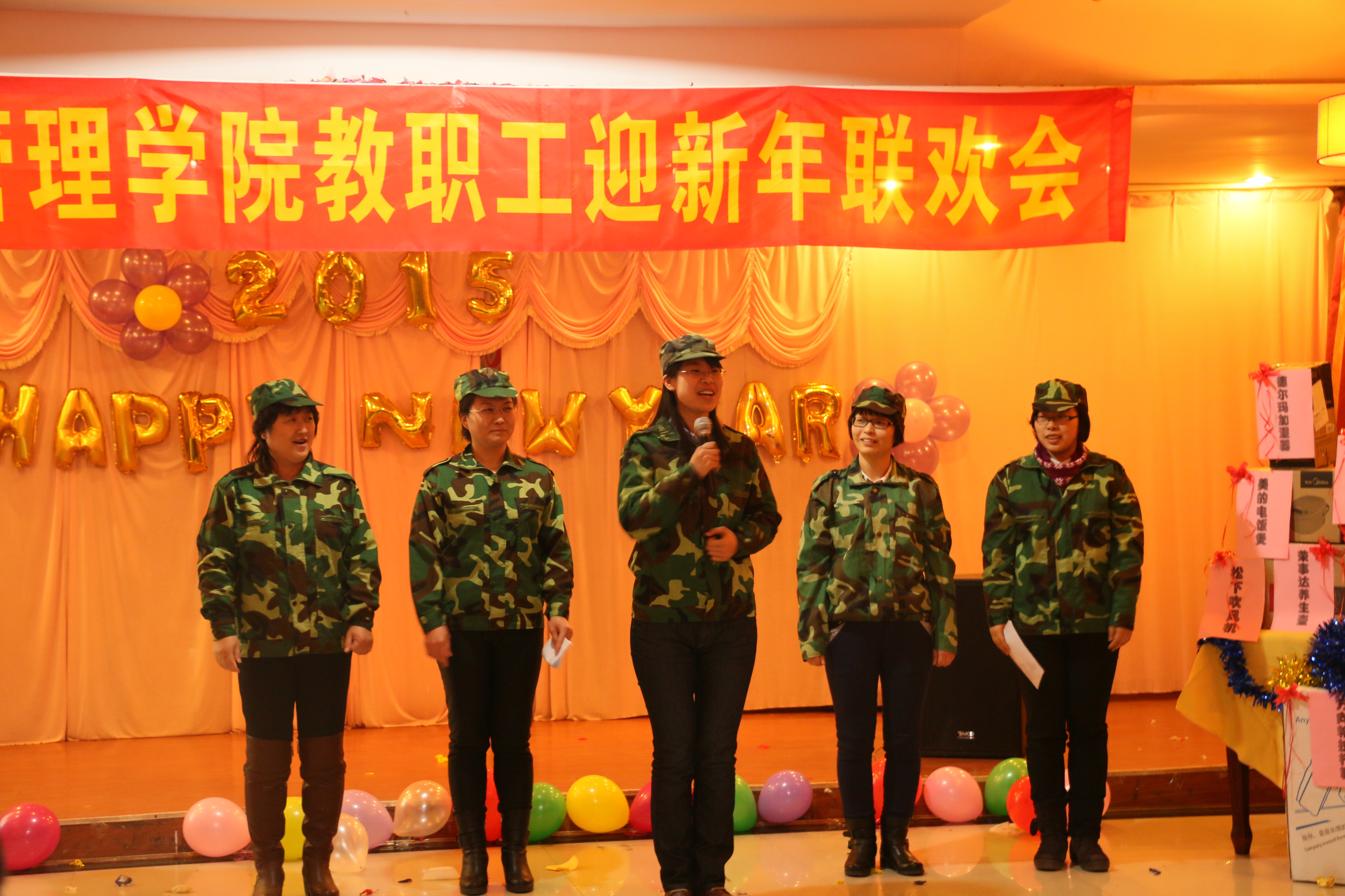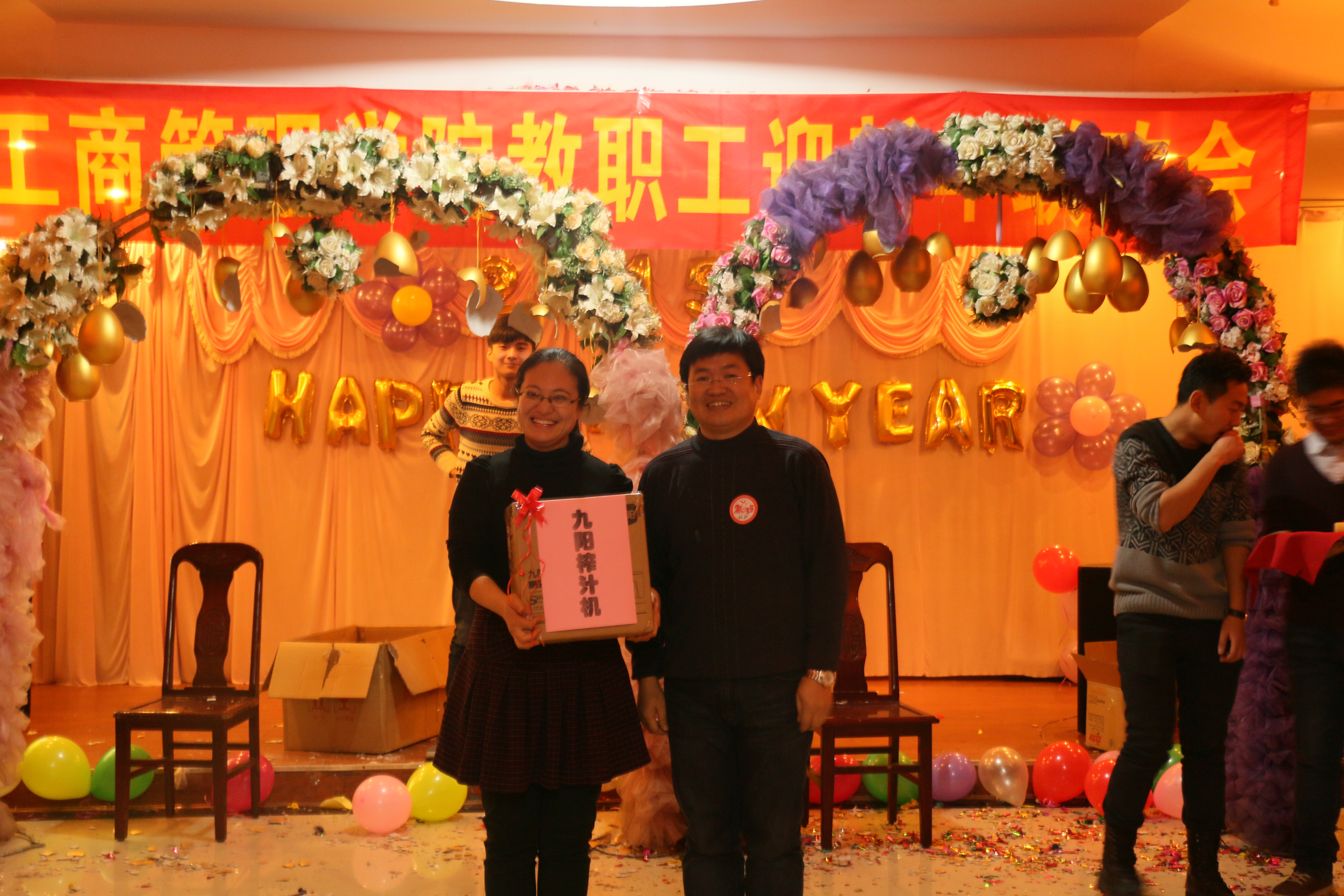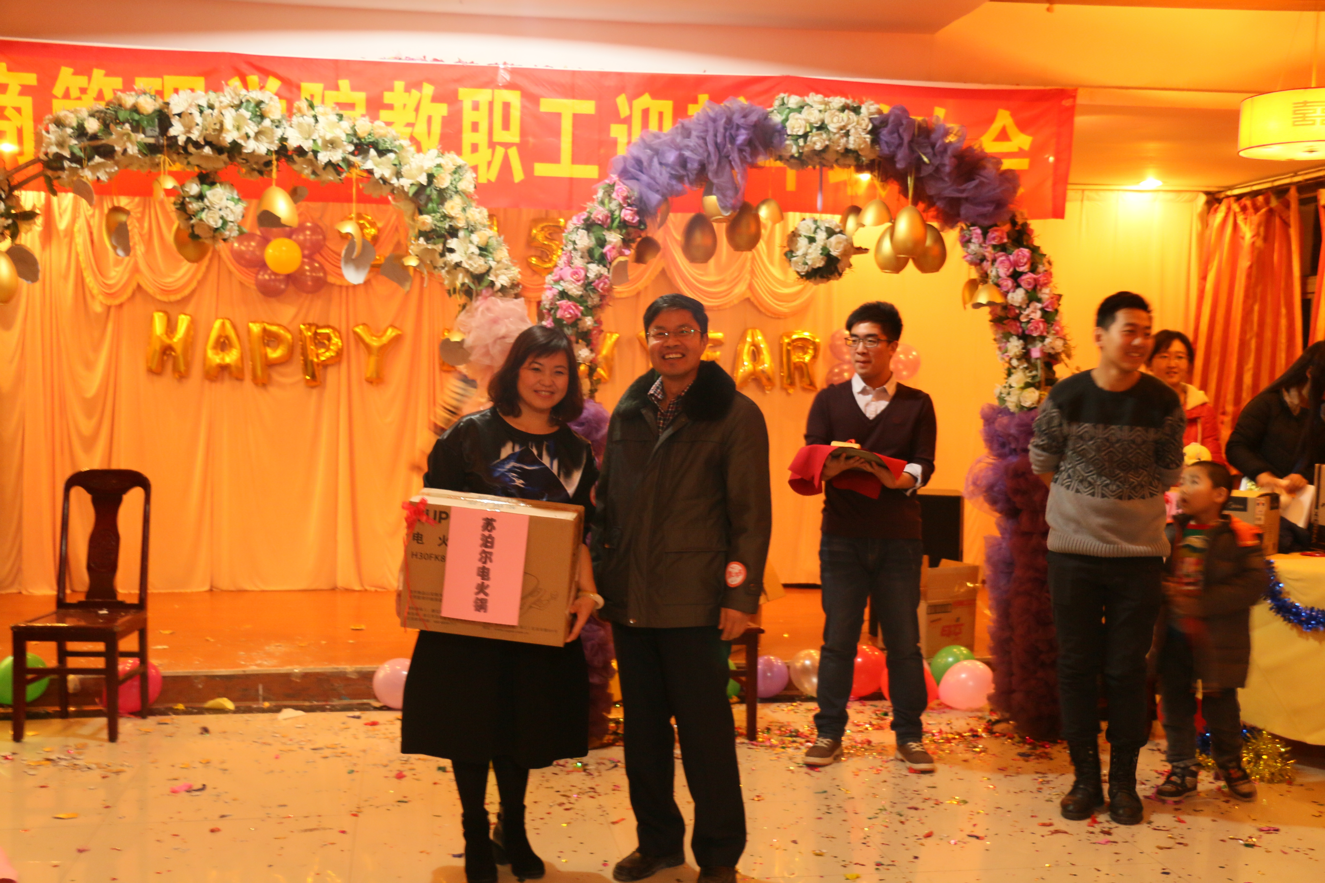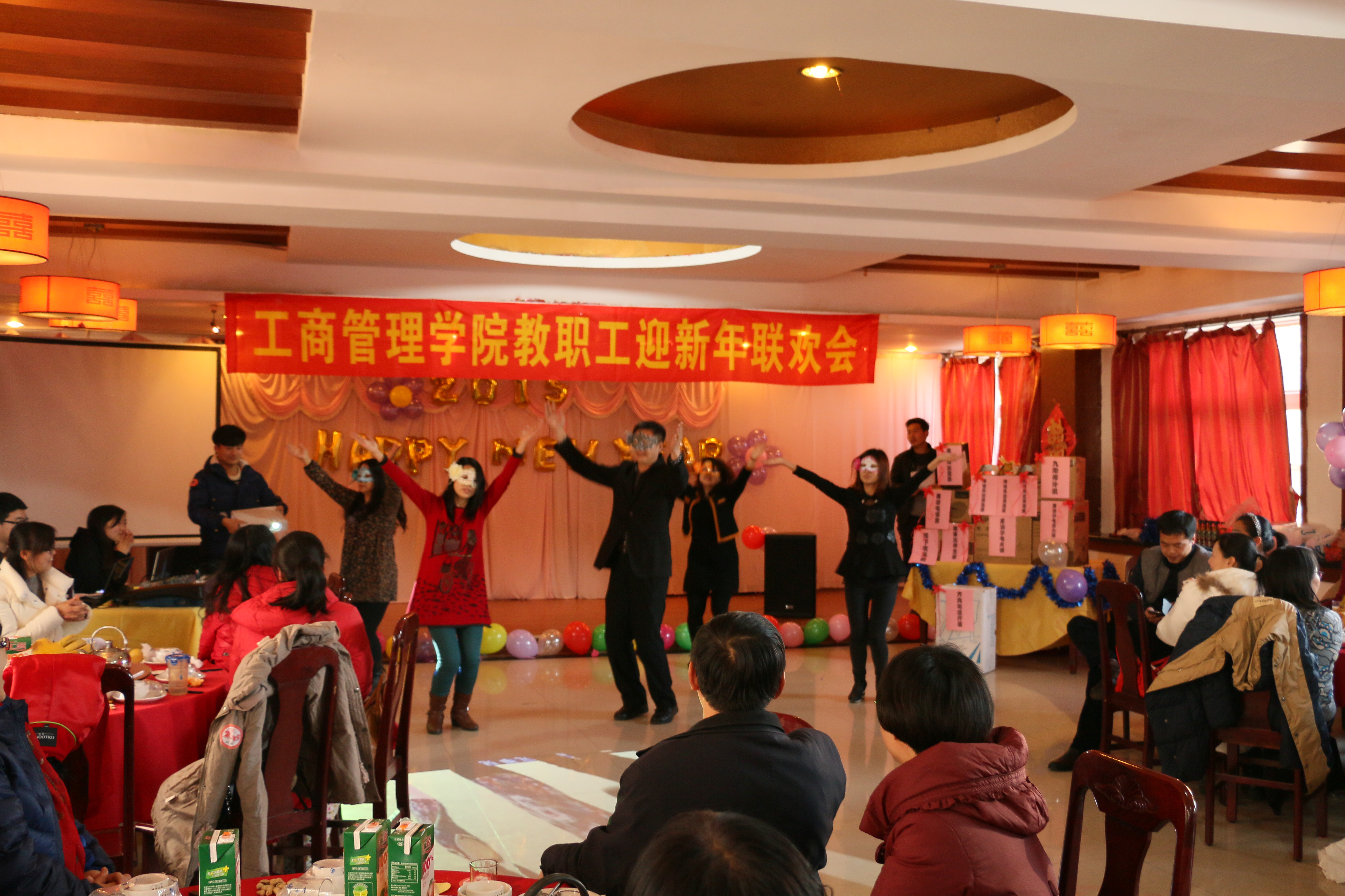 2014年12月25日15:30,2015年新年联欢会在公司党委书记侯金柱教授的新年致辞中拉开帷幕。本场联欢会不仅有各位教师精心准备的精彩节目,还有趣味十足的游戏,更有让人心动的幸运砸金蛋抽奖时刻,可谓异彩纷呈。主持人幽默生动的语言、老师们惟妙惟肖的表演、现场观众火爆的热情,整场联欢会热闹非凡。旅游教学部的舞蹈《倍爽》、人资教学部《感恩的心》、市场营销教学部的戏曲联唱、信息教学部的合唱《小苹果》、基础教学部的《大海啊故乡》、物流管理教学部的《今夜无眠》,还有魔术、独唱、交谊舞等精彩的节目将老师们的多才多艺表现的淋漓尽致。最后的“幸运砸金蛋”更带动了晚会活跃的气氛,紧张且充满期待的抽奖,掀起了晚会的高潮!