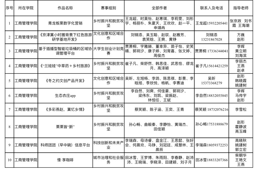 经过前期书面评审结果,15份作品进入答辩环节,项目涵盖科技创新和未来产业、乡村振兴和脱贫攻坚、城市治理和社会服务生态环保和可持续发展、文化创意和区域合作等领域。各参赛项目的主要负责人,通过PPT演示方式,围绕项目概况、市场前景、产品概况、项目实效性、财务分析等情况进行介绍。随后,评委老师再对各个小组提出改进建议。经过严格把关、认真评选,最终选出10份优秀作品参加校级复赛。具体名单如下: