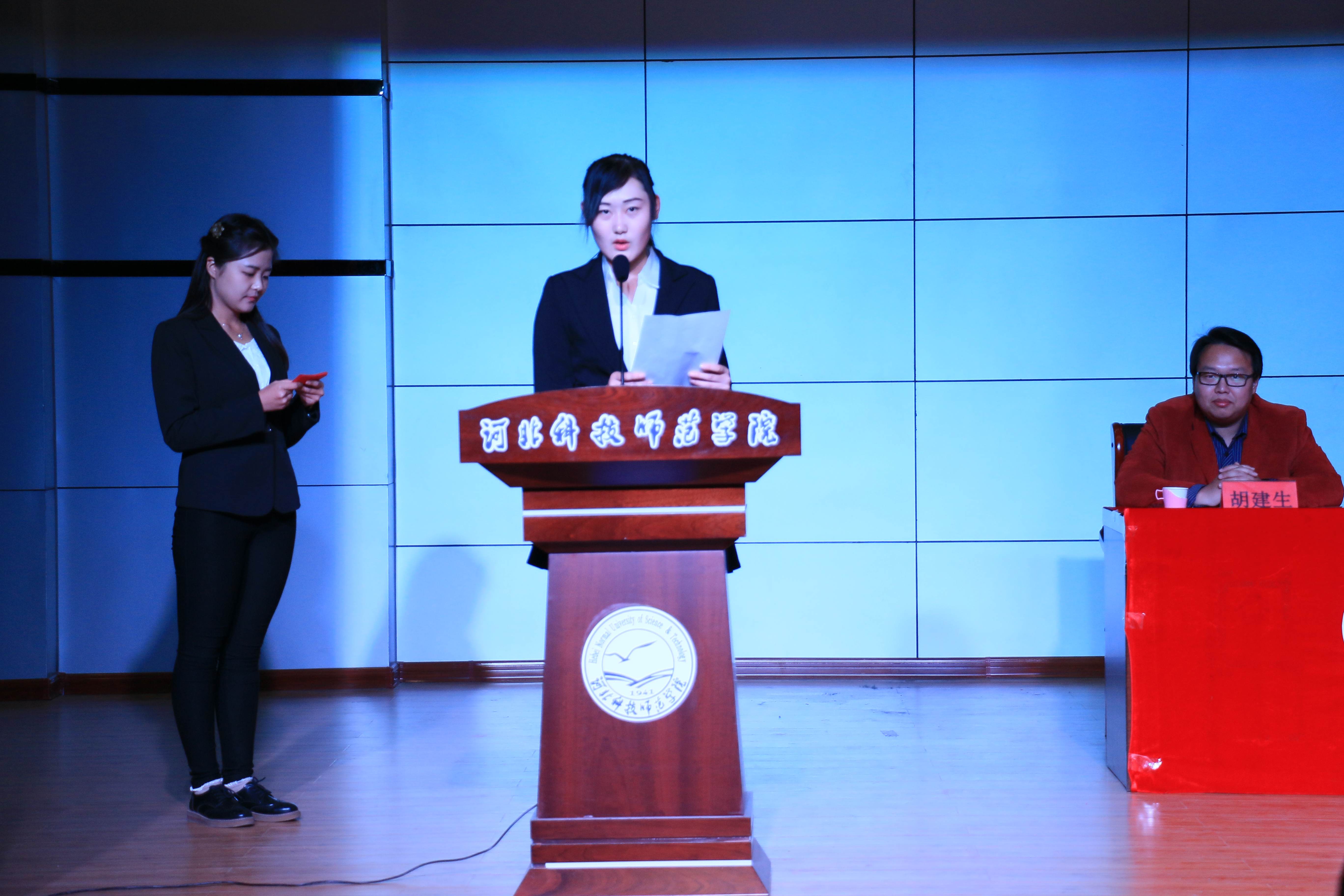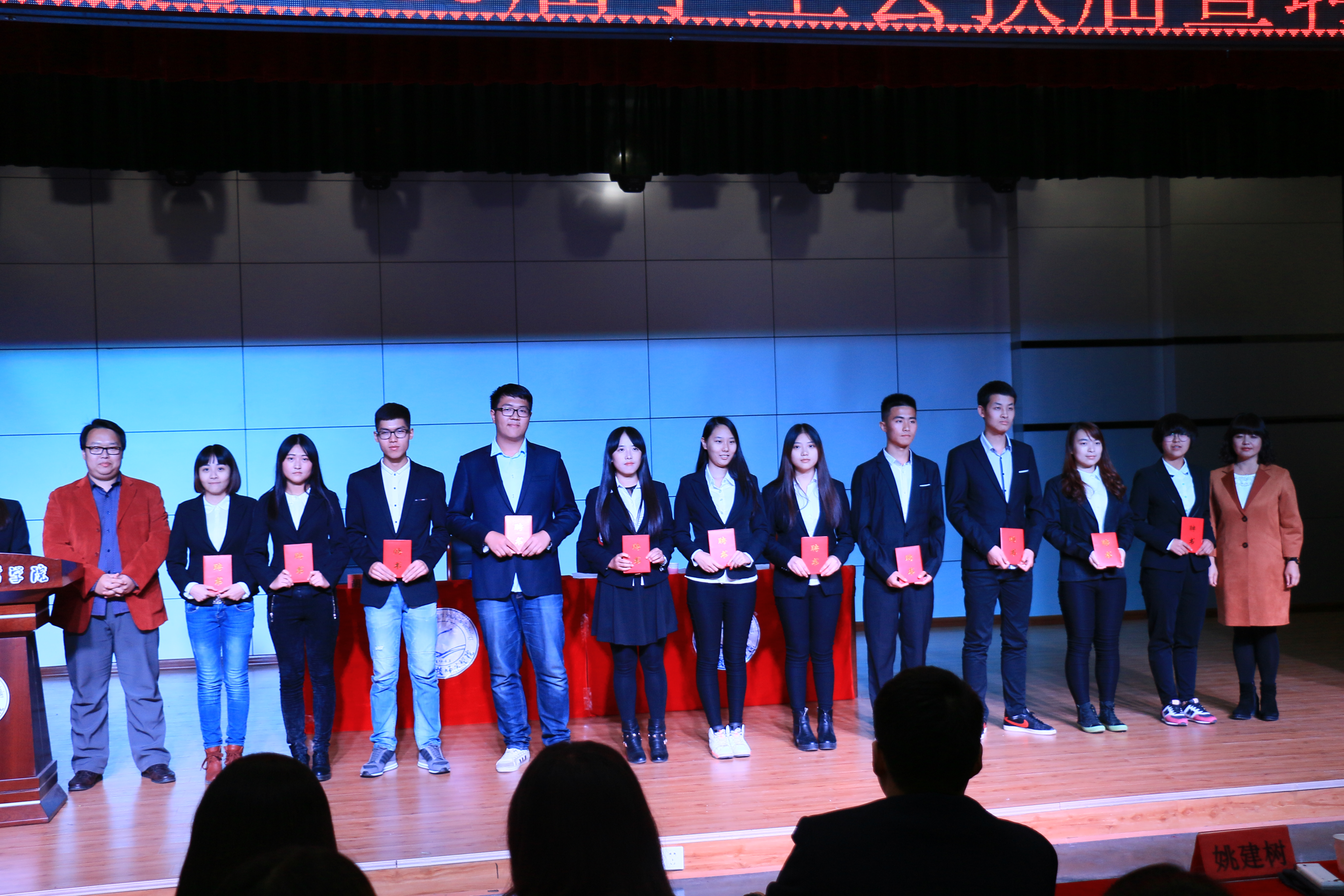 仪式开始了,首先全体起立奏唱国歌,接下来由2014届工商员工会主席李苑发表讲话,工作三年,满怀对员工会的感情,并提出了对下一届员工会成员的要求和期盼,打造精品工商。接下来韩老师和胡老师为前一任员工会主席们颁发纪念品,带着的不仅是纪念品更是老师和同学们的热情和期待!接着李强华教授和韩晓霞老师分别公布新一届员工会成员聘任名单,由李强华教授为各个主席们颁发聘书,胡建生老师宣布员工会各个部门的部长们和主席团下属机构负责人名单,由韩老师和胡老师为部长们颁发聘任证书,新一届成员们面带笑容光荣上岗,代表的是一种责任!接着由王泽强主席讲话,言辞坚定,提出了对工商员工会的工作规划和工作要求,为打造精品工商不懈努力!最后由刘恩峰教授做贺词,此次仪式圆满结束。